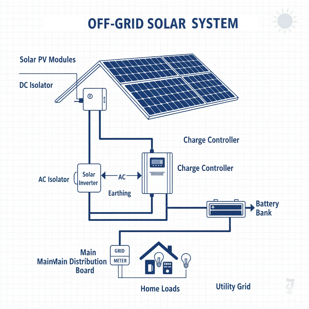 In this situation there will be only single source of power i.e. Rooftop Solar Panel and the generated power will be fed to a OFF GRID Inverter, which is equipped with Solar Charge Controller too for charging the battery bank.
